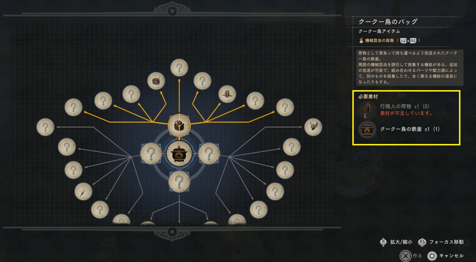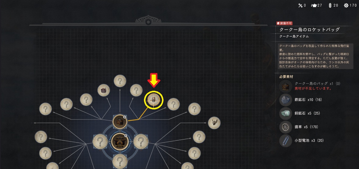 クリアの為に作成するものは【クークー鳥のロケットバッグ】です。ただ、必要素材として【クークー鳥のバッグ】が必要となるので、まずはバッグの方から作成しなくてはいけません。