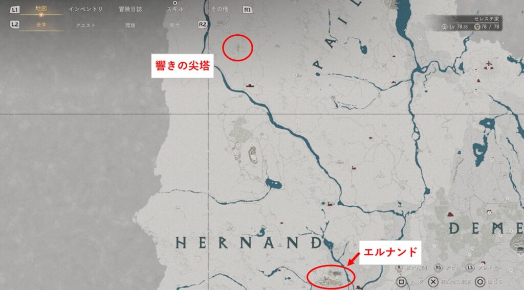場所はエルナンドからかなり北の方に行ったところです。おそらくですがメインストーリーには絡んでこない尖塔だと思います。