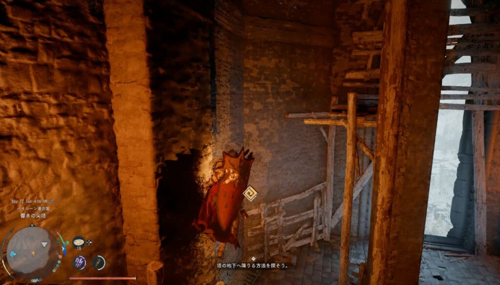 塔の中に入ったらまずは木の足場が組まれているエリアをどんどん上に登っていきます。「塔の地下へ降りる方法を探そう」って出てるけど上に登ります。
