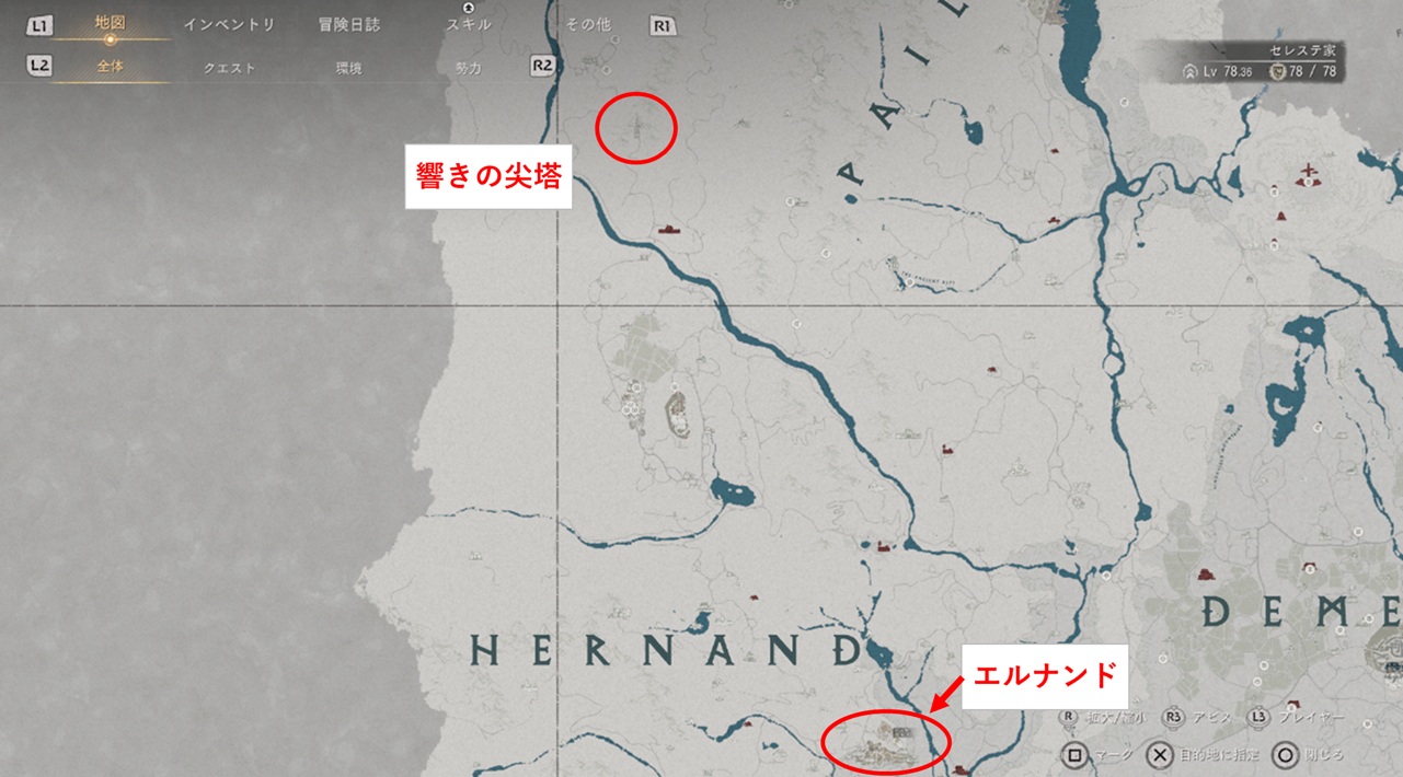 場所はエルナンドからかなり北の方に行ったところです。おそらくですがメインストーリーには絡んでこない尖塔だと思います。