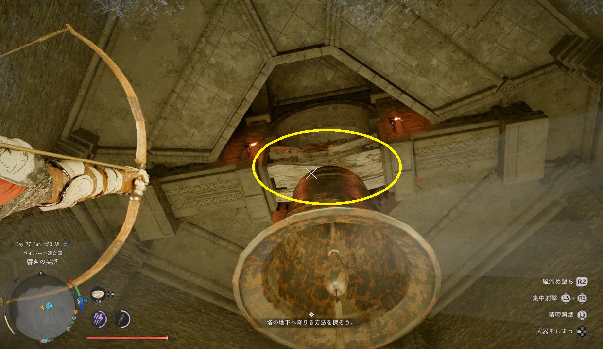 大きな鐘のところまで来たら鐘がぶら下がっている白い部分を弓で撃ちます。これで鐘が下に落下して地下へ行けるようになります。