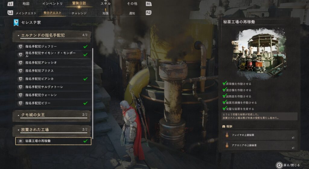 「秘密工場の再稼働」は勢力クエストのセレステ家を進めていくと出現するクエストで、最終的な報酬として肥料噴霧器が入手できます。クリア手順をまとめてますので迷っている方は参考にしてください。
