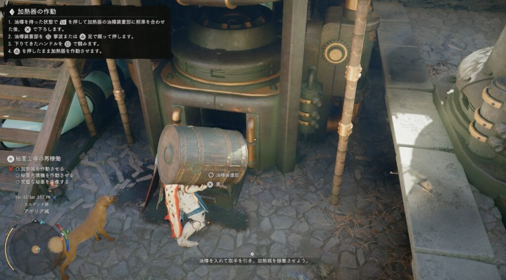 蹴りが出るとセットした油樽が外に飛び出して来て加熱器の火が消えてしまいます。こうなるとクエストは進行している(1回火が点いたから)のに一生クリアできない状態になりますので、加熱器の油樽が奥にはまっていて火が点いているか確認してください。