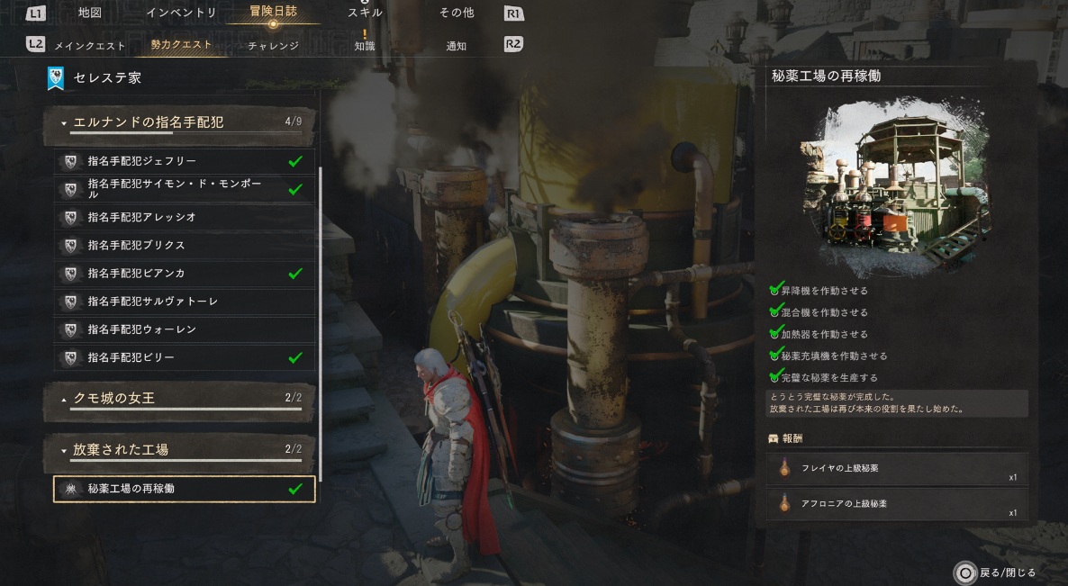「秘密工場の再稼働」は勢力クエストのセレステ家を進めていくと出現するクエストで、最終的な報酬として肥料噴霧器が入手できます。クリア手順をまとめてますので迷っている方は参考にしてください。