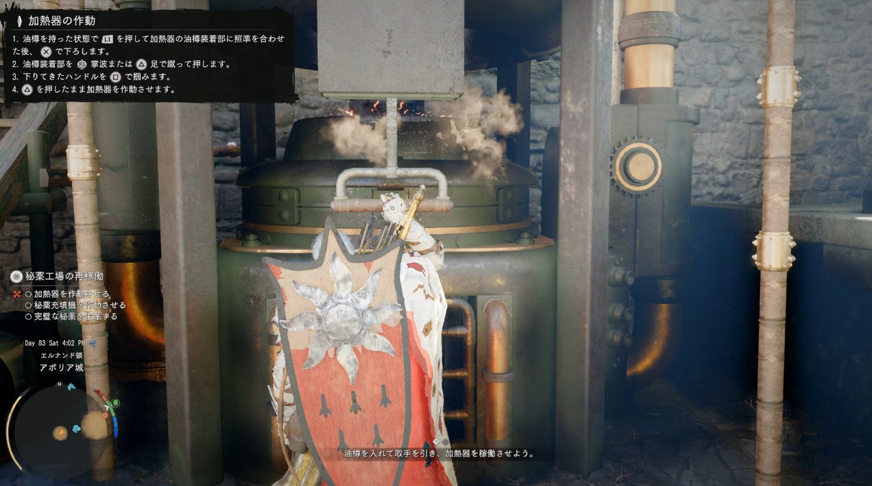 蹴りが出るとセットした油樽が外に飛び出して来て加熱器の火が消えてしまいます。こうなるとクエストは進行している(1回火が点いたから)のに一生クリアできない状態になりますので、加熱器の油樽が奥にはまっていて火が点いているか確認してください。