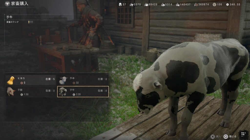 乳牛も初期のメインクエストで登場したブレマーの好感度を100にすると、拠点で購入できるようになります。