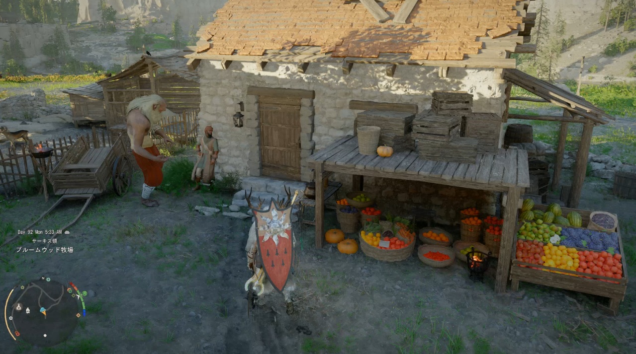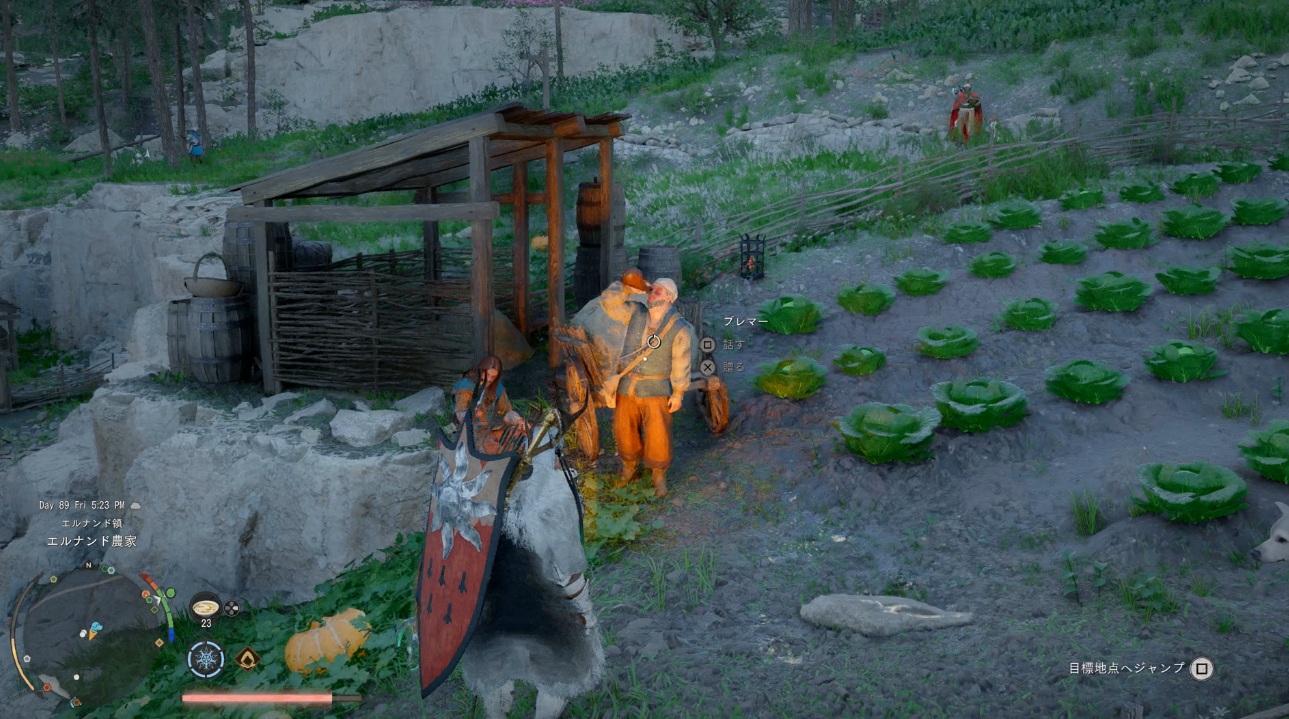 ブレマーはエルナンドの南にあるエルナンド農場で酒を飲んでました。このNPCも時間帯で出現する場所が変化するという話があって、夜はエルナンドの酒場に出没するという噂も…。