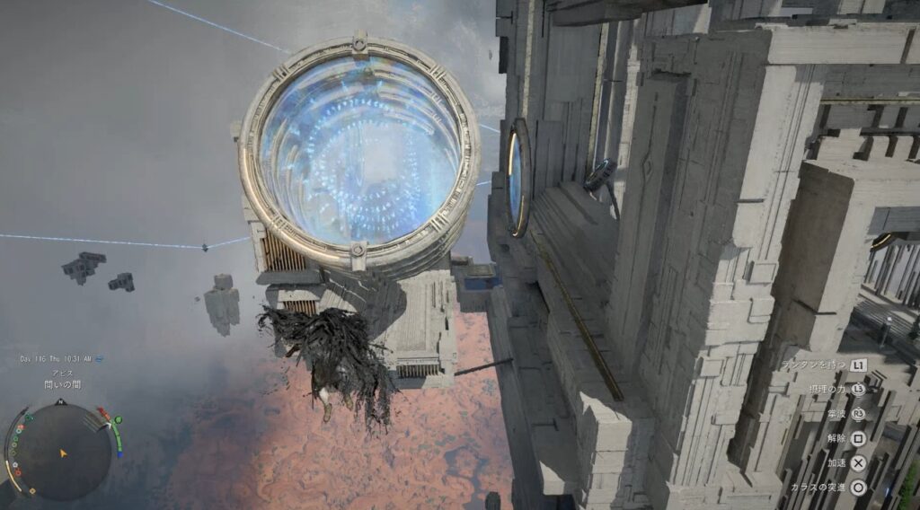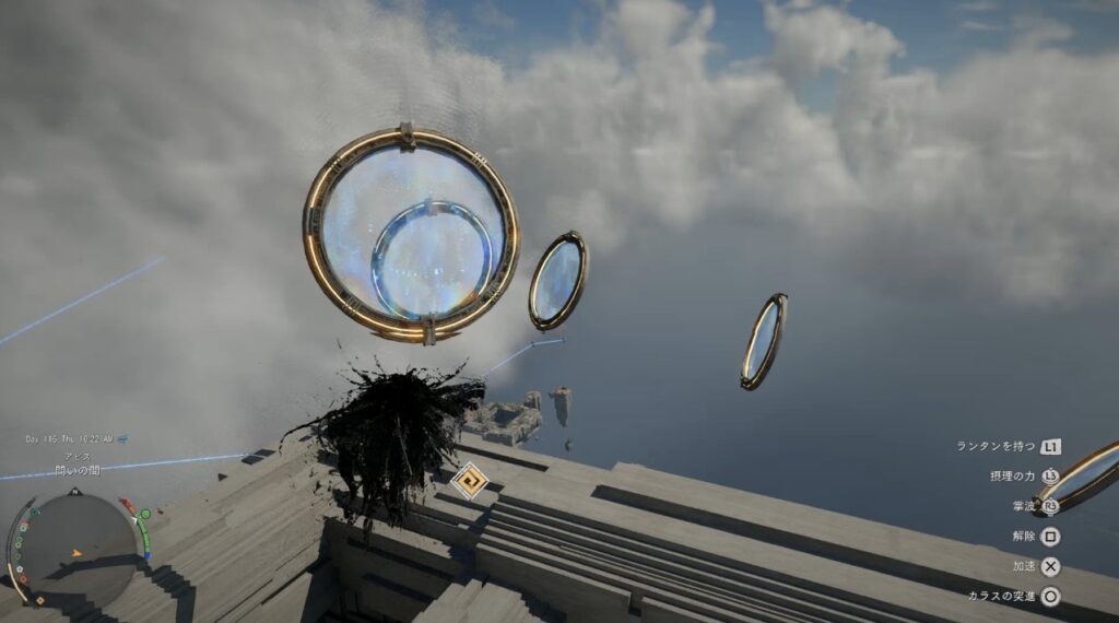 輪の中の青い膜を破りながら空を飛んで移動。どうやら時間制限があるっぽいのである程度は急いで通過する必要がありそう。とはいえカラスの突進とかを使わなくても間に合います。