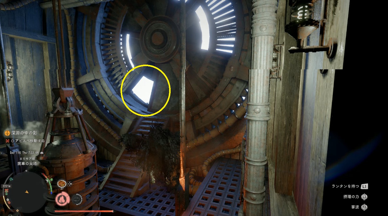 中に入ったら中央柱についているレバーにぶら下がる。これで歯車が動きだすので上の方へよじ登っていく。