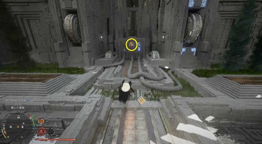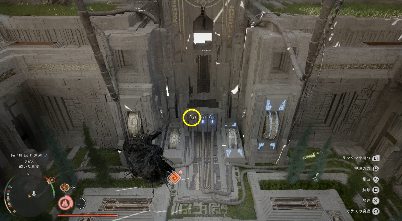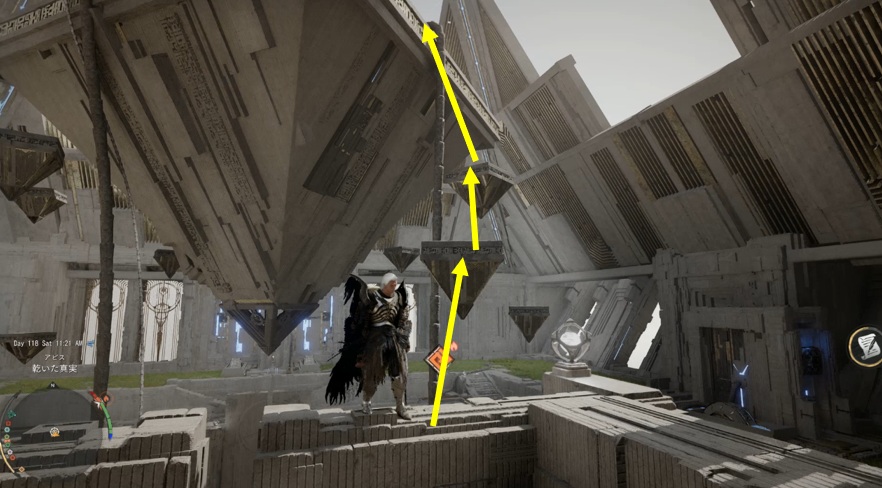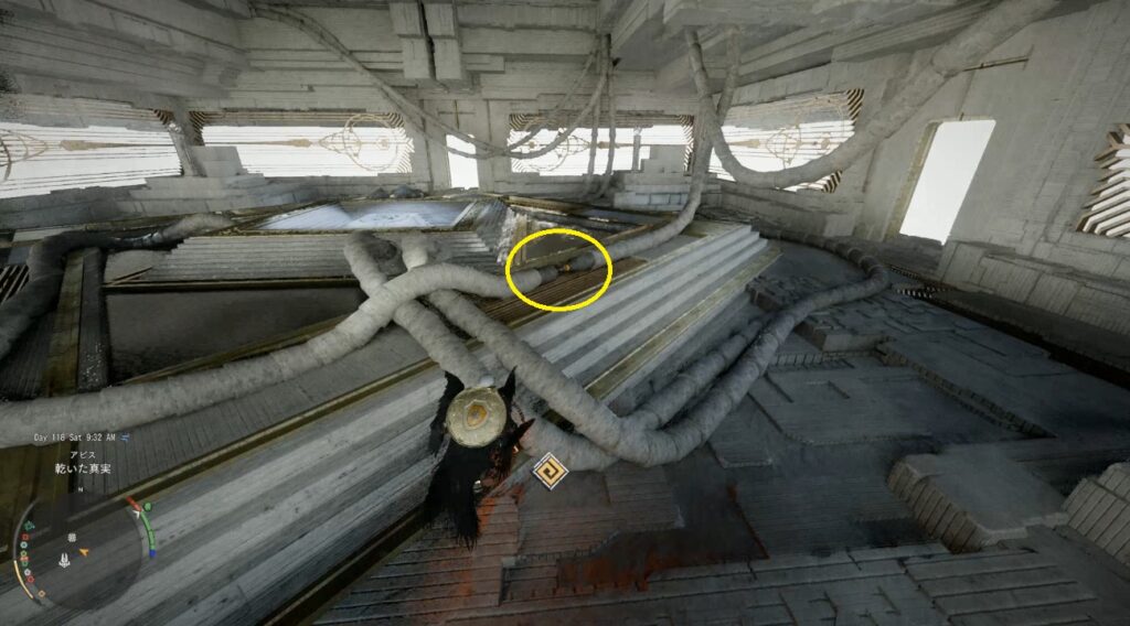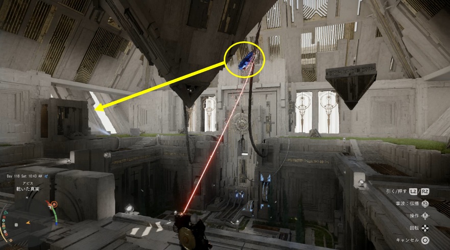 ケーブルを接続したら上に戻って画像のところに摂理の力(最初に摂理の力をした場所)。これで空中に足場がもう一つ出現します。
