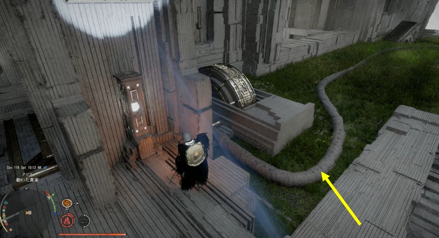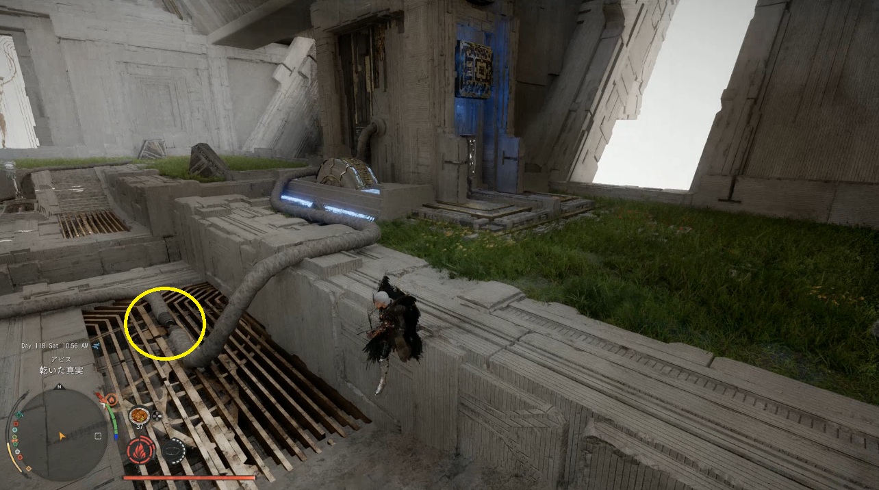 ファストトラベルから飛んで建物の中に入ったら、まずはパイプを繋ぎます(場所は画像を参考に)。このパイプを繋いだ後に中央の白く光っている部分に乗るとエレベーターのように上に移動できます。