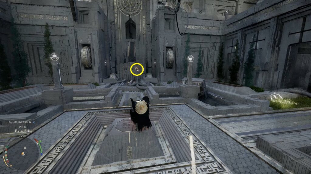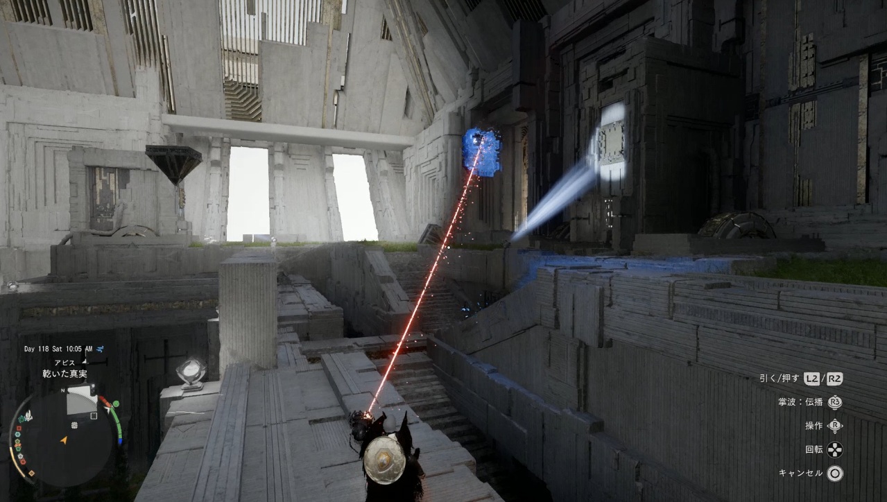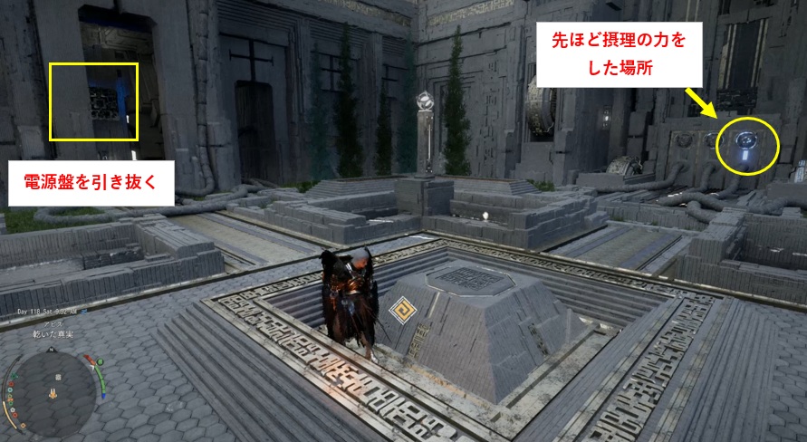 ここまで終わったら最初に摂理の力をした場所に戻って一番左にある装置に摂理の力。これで3つとも青く光っているはずで、上に付いている中央電源盤にアングルが変わります。