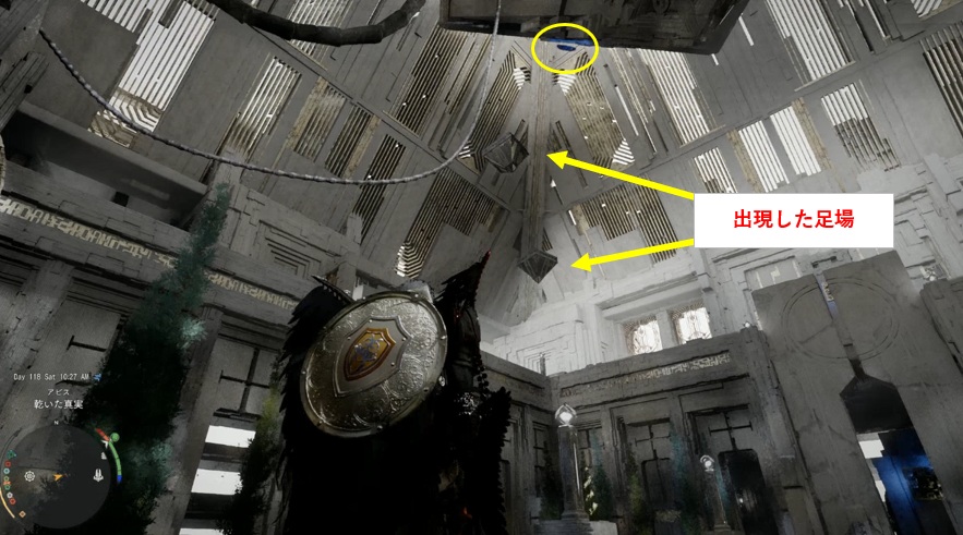 あとは空中に出現した足場を使って上に登りアビスアーティファクトを回収すれば乾いた真実は終了です。