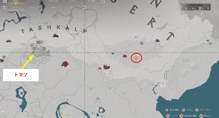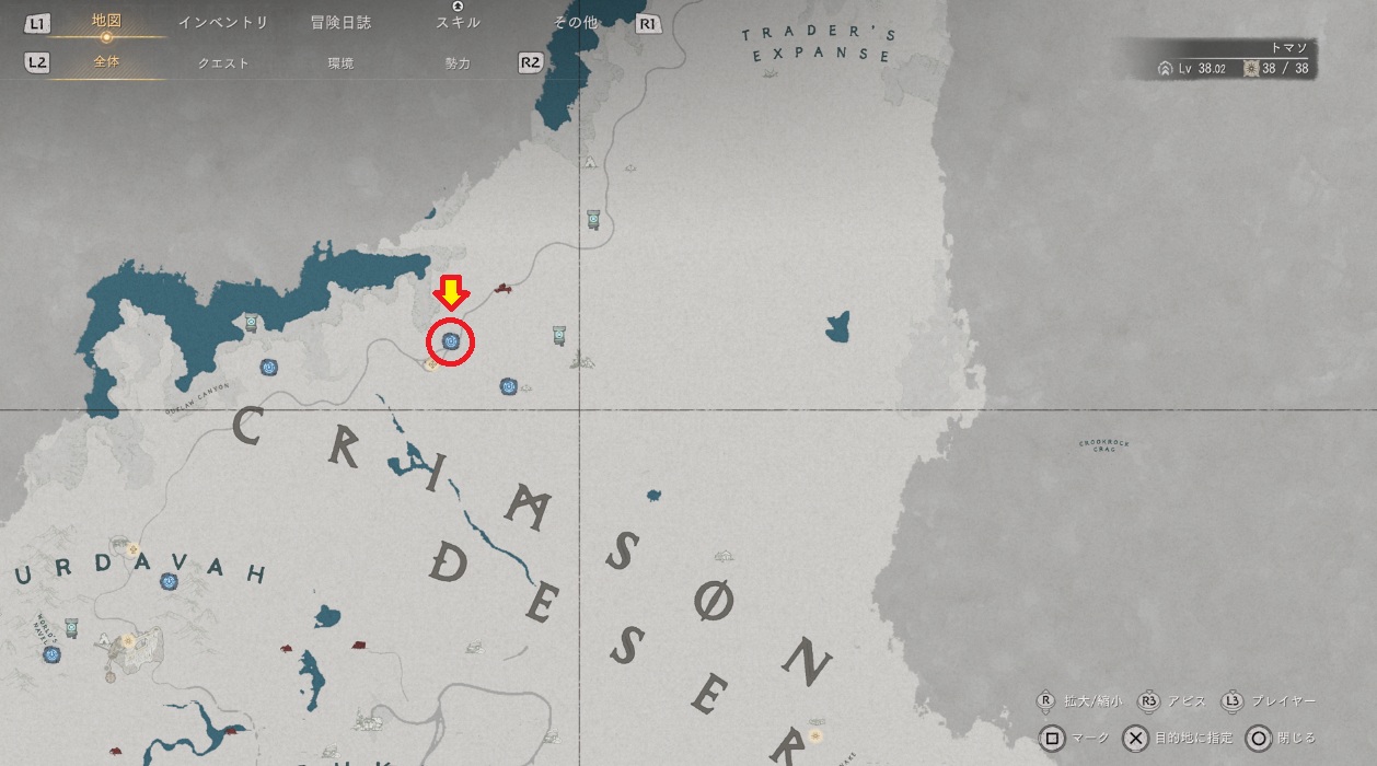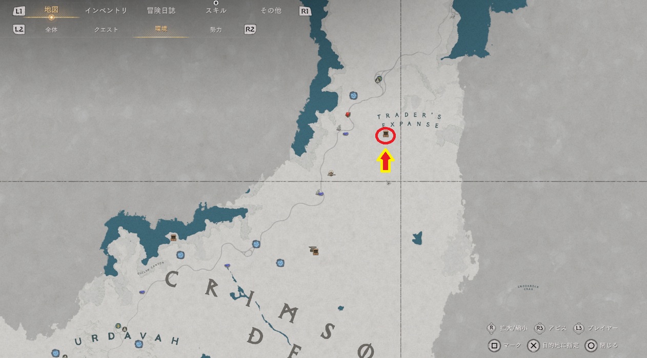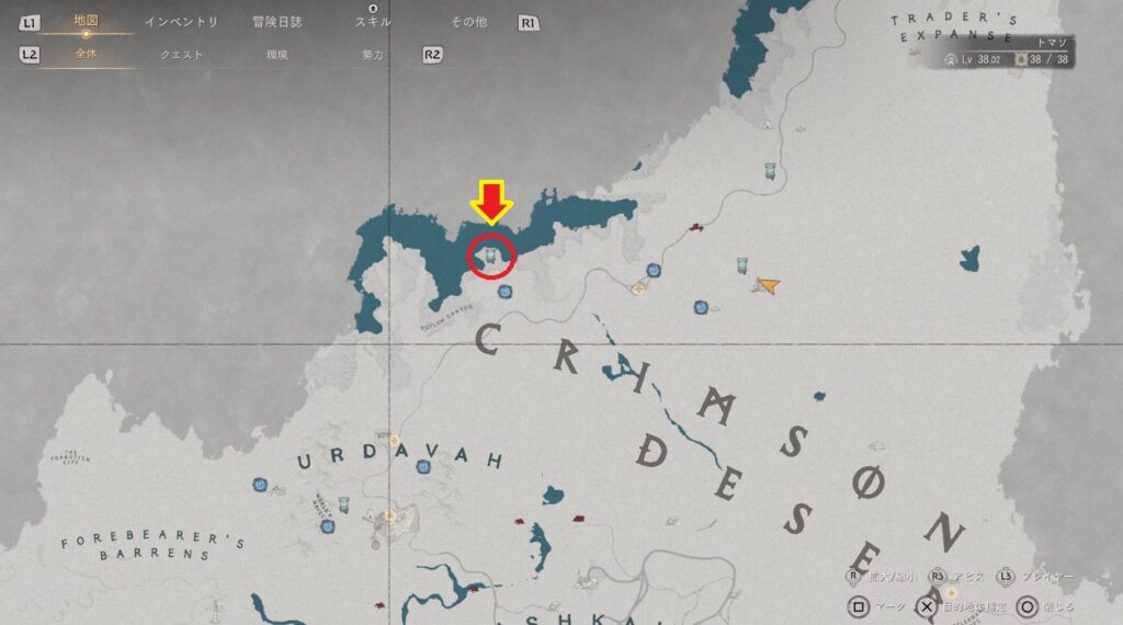 場所は紅の砂漠エリアの北の方です。マップだとTRADER’S EXPANSEの「E」の少し下くらいで該当の場所は砂漠の難破船という形で表示されます。