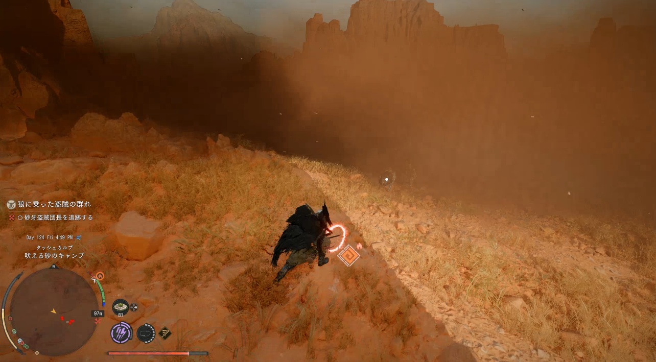 そもそも何でクエストを受けた方がいいかっていうと、吠える砂のキャンプ周は砂煙が常時発生していて視界が異常に悪いからです。