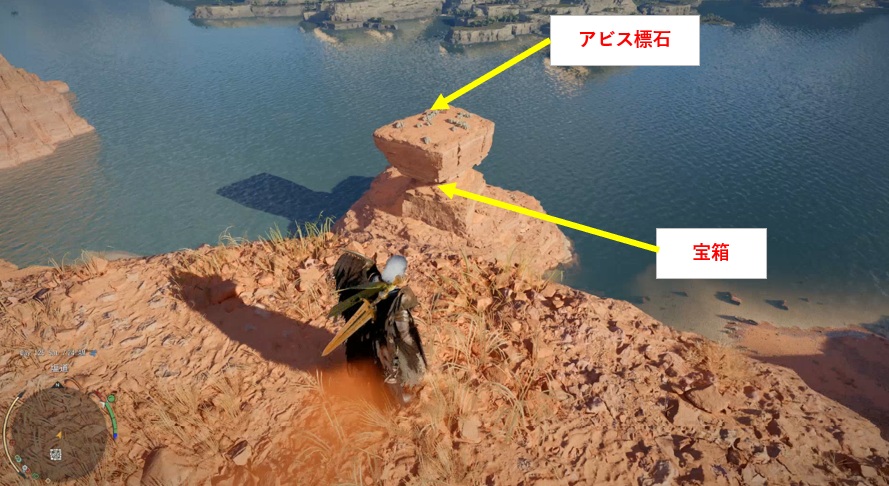 目指すのは水場に面した高台です。高台の上にアビス標石、岩のくびれた部分に宝箱があってその中に戦場の光のサークレットが入ってます。
