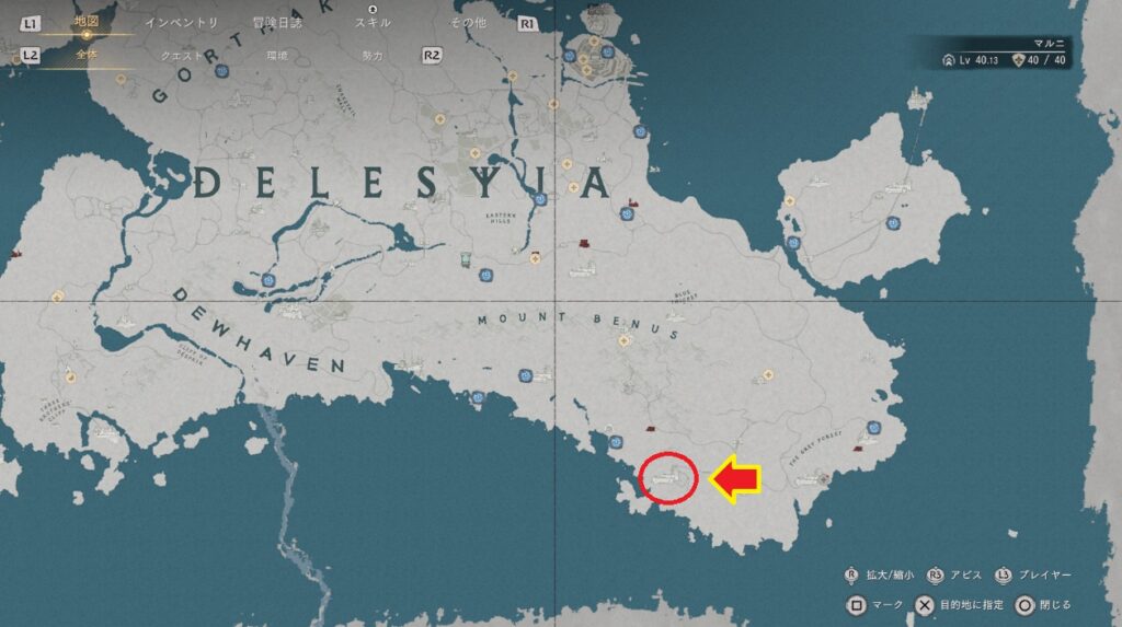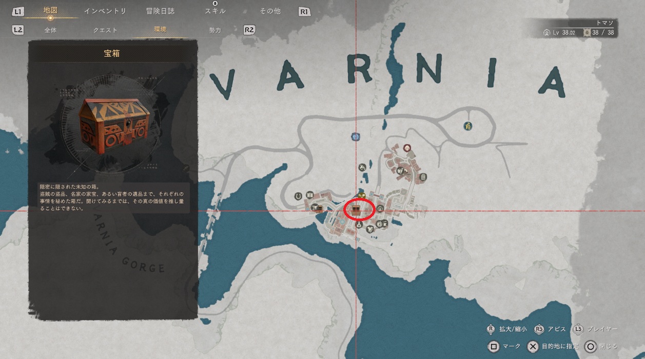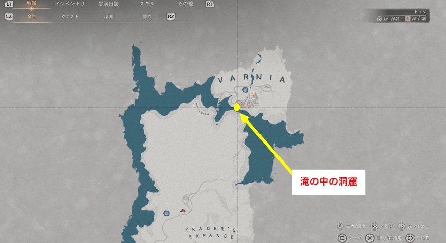 戦場の光のマントの場所はマップ北東の端にあるヴァルニアという街です。街の南に滝があってその奥にある洞窟内にある宝箱に入っています。