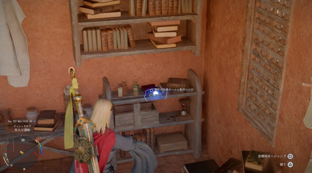 中に入ったら壁の四角い部分に掌波。奥へ進むと棚の上にレシピが置いてあります。