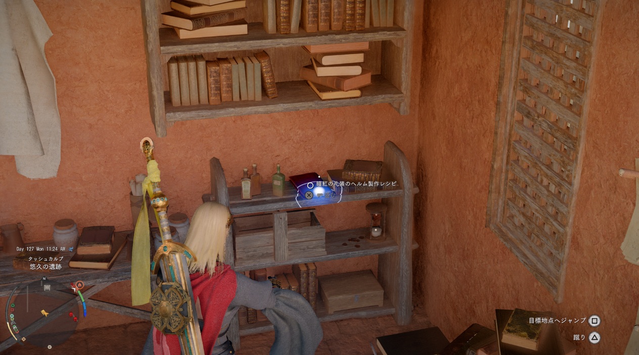 階段を上がったところにある本棚に暗紅の礼装のマントのレシピがあります。