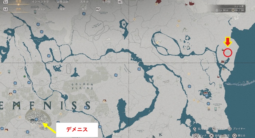 暗紅の礼装のレザーアーマーはデメニスから東の方へ行った熱帯雨林地帯にあります。熱帯雨林地帯に密林の遺跡という場所があるのでそこを目指しましょう。