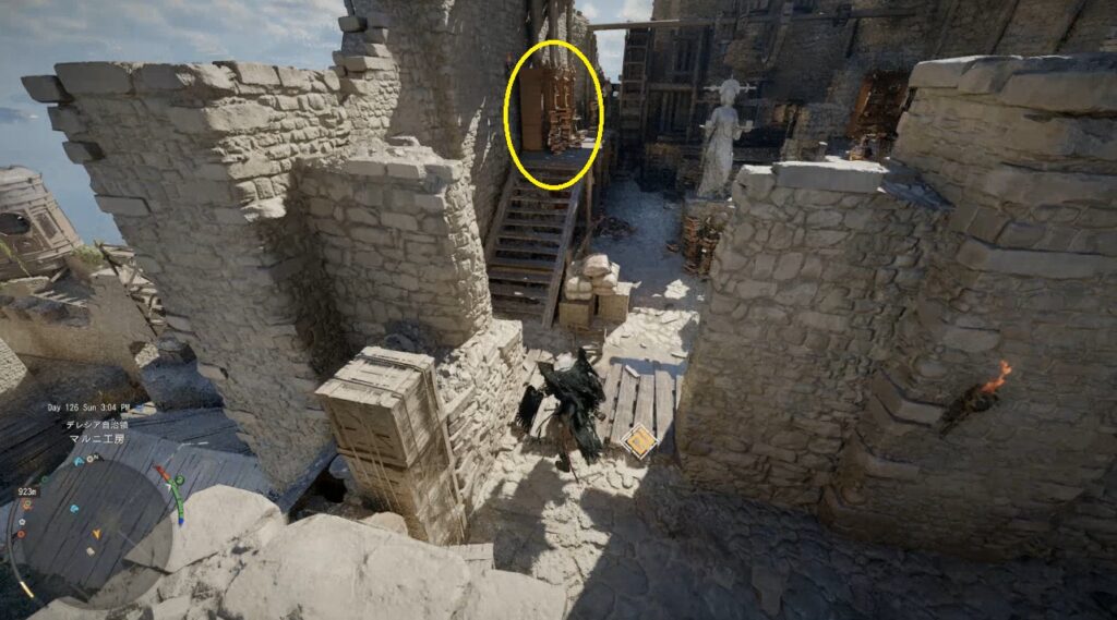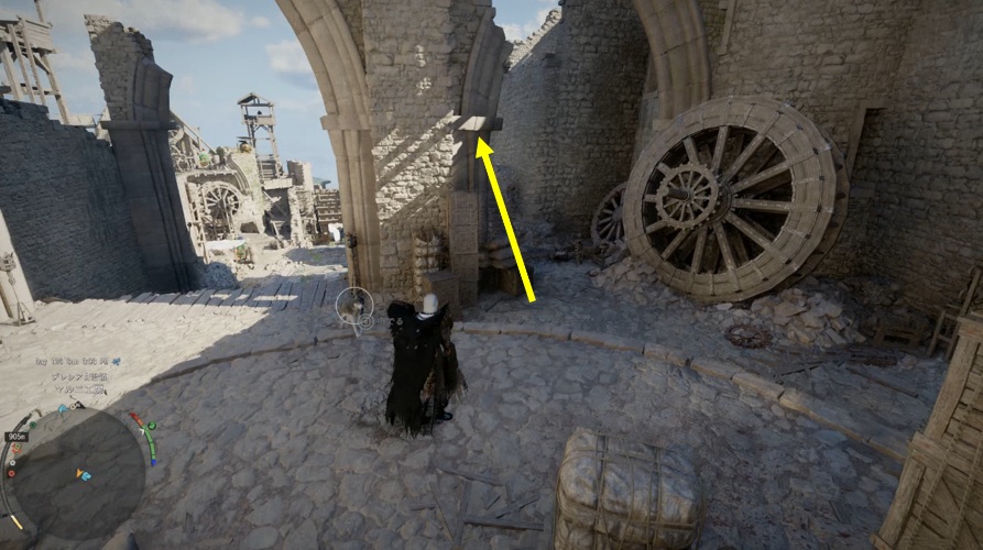 ミニマップに表示される道をそのまま進んで道の表示が途切れるまで進む。デカい歯車が置いてある場所に出るのでその横にある階段を上って奥へ進む。