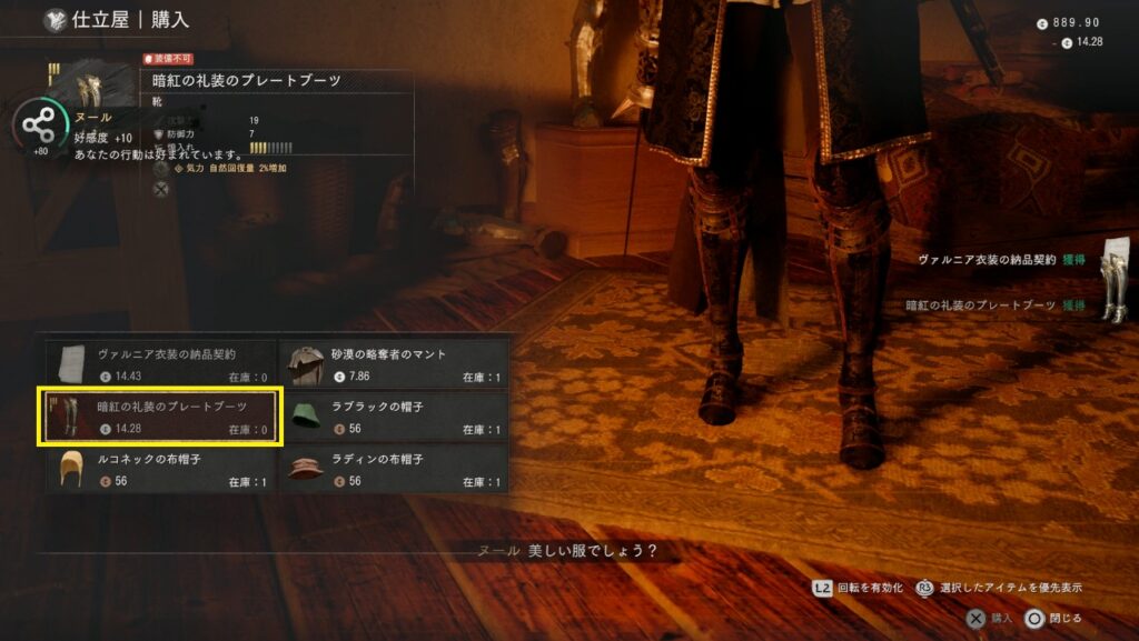 好感度100で暗紅の礼装のプレートブーツが購入できるようになります。これだけはレシピではなく現物の購入になります。好感度を上げる為に銅貨袋や花かごを用意しておこう。