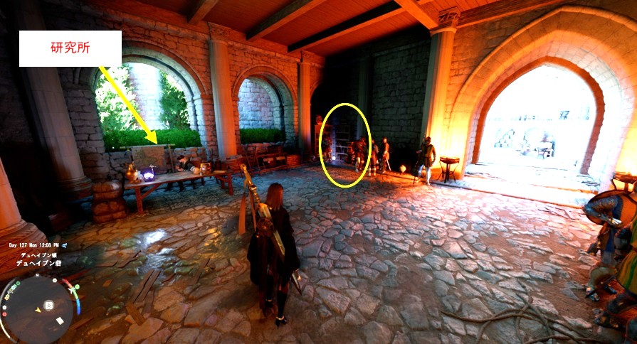 デュヘイブン砦に着いたら研究所があるところを目指します。研究所の横にある本棚に暗紅の礼装のプレートグローブのレシピがあるので盗んでしまいましょう。