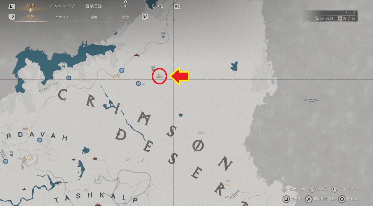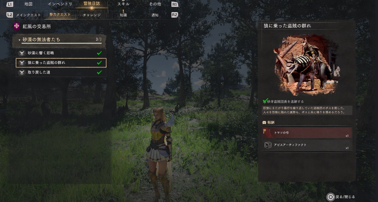 吠える砂のキャンプは[勢力クエスト-紅の砂漠-紅風の交易所-砂漠の無法者たち]というクエストで行く事になります。