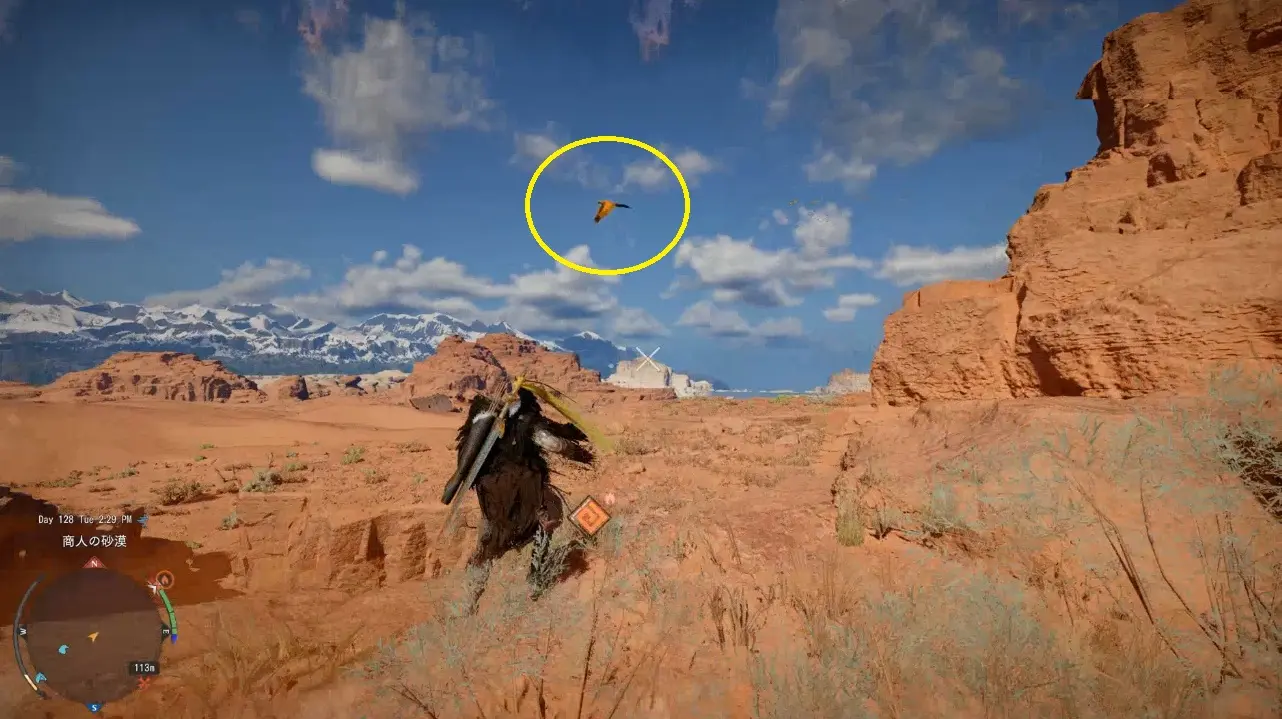 現地の近くにいくと黄色くて大きめの個体が空を飛んでいて、これがフェニックスです。弓ですぐに撃ち落とせますので、心は痛みますが倒してしまいましょう。