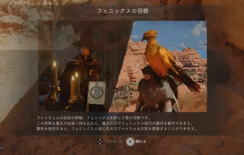 フェニックスを解体するとフェニックスの羽根が手に入ります。これを魔女のところへ持って行くとフェニックス同行の護符を製作することが出来ます。