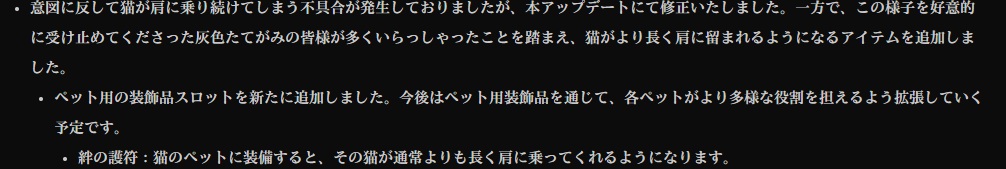 ですが、猫が長時間にわたって肩に乗り続けてしまうのはどうやら不具合だったらしく…。今回のパッチで猫がより長く肩に留まれるアイテムが追加されました。