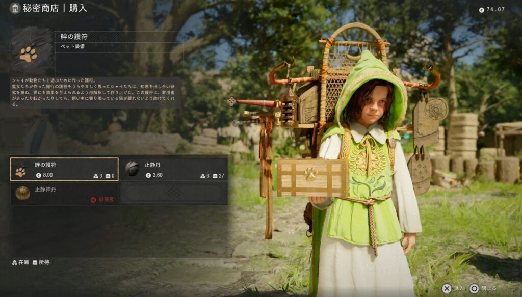 レイシーは秘密商店となっていてこちらから絆の護符が購入できます。他にも止静丹と止静神丹(好感度100)の購入も可能です。