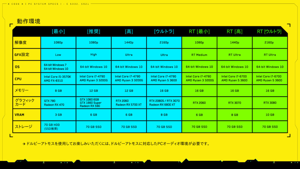 ゲーム容量が70GBありSSDを推奨しているので、それなりに大きめのSSDが必要なようですね。HDDでも動くんでしょうがロードとかが長くなりそうです。CPUとグラフィックカードは、そこまで要求スペックは高くない。GTX1060などは数年前のものなので、最新のものでなくても大丈夫だとは思います。