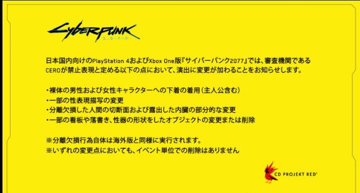 サイバーパンク2077は日本国内のPS4/XBOX版で表現規制が入っており、描写が変更となっているシーンが多いようです。