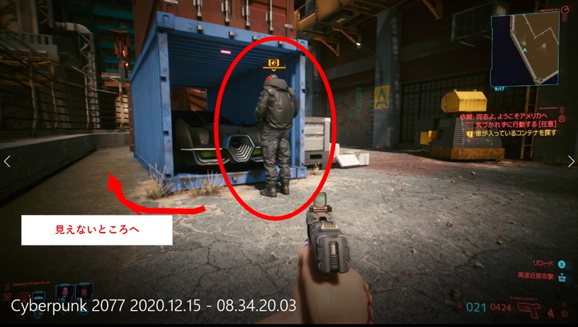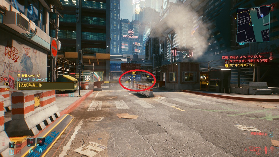 ワトソンのカブキ地区埠頭あたりに行くと発生する依頼です。敵の数が比較的多く任意任務もあるので、可能であればステルス状態で気づかれずに行動した方がいいでしょう。