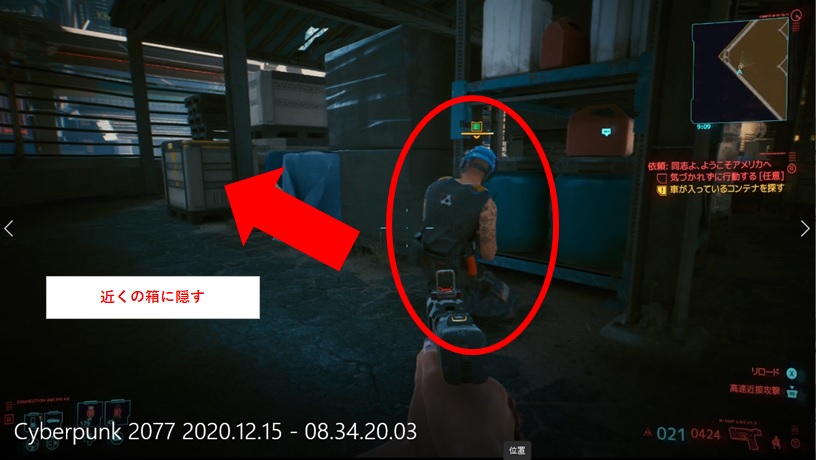 このルートだと倒さなきゃいけないのが二人くらい。グラップルしながら近くの箱に隠してしまいましょう。隠さないと見つかってしまうので注意です。