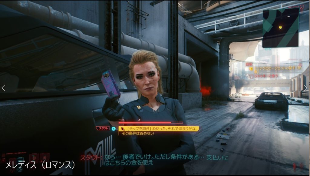「[チップ]を受け取る。それで決まりだな」を選択しミリテクのチップを受け取る。