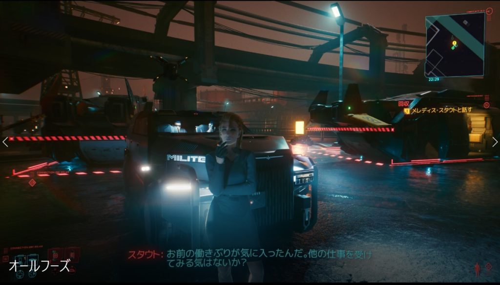 サイバーパンク2077では、特定の行動・選択肢で進めていくと恋愛イベント(ロマンス)が発生するキャラが何人か存在します。ここでは序盤に登場するメレディス・スタウトとのロマンスに発展させる方法を解説いたします。※他にも方法(選択肢)があるのかもしれませんが、わたしがロマンスへと発展させた方法を記載しておきます。参考にしてください。