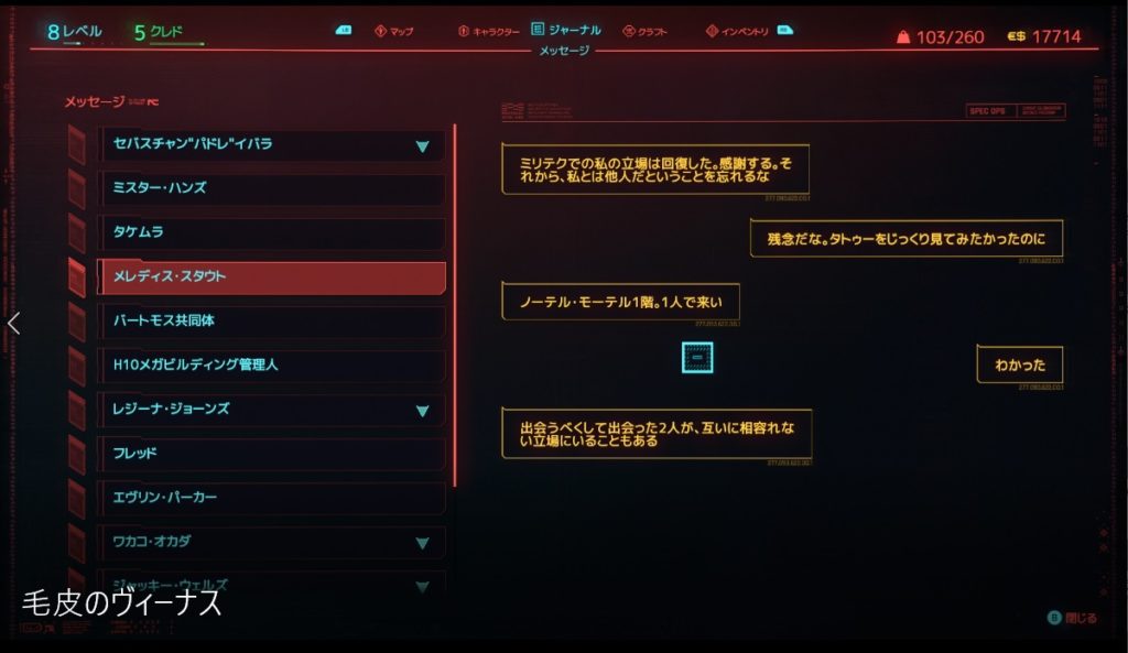 ACT1「回収」のパート始めにメレディス・スタウトと連絡を取る。ここで連絡を取らないと二度と出てこないと思います。