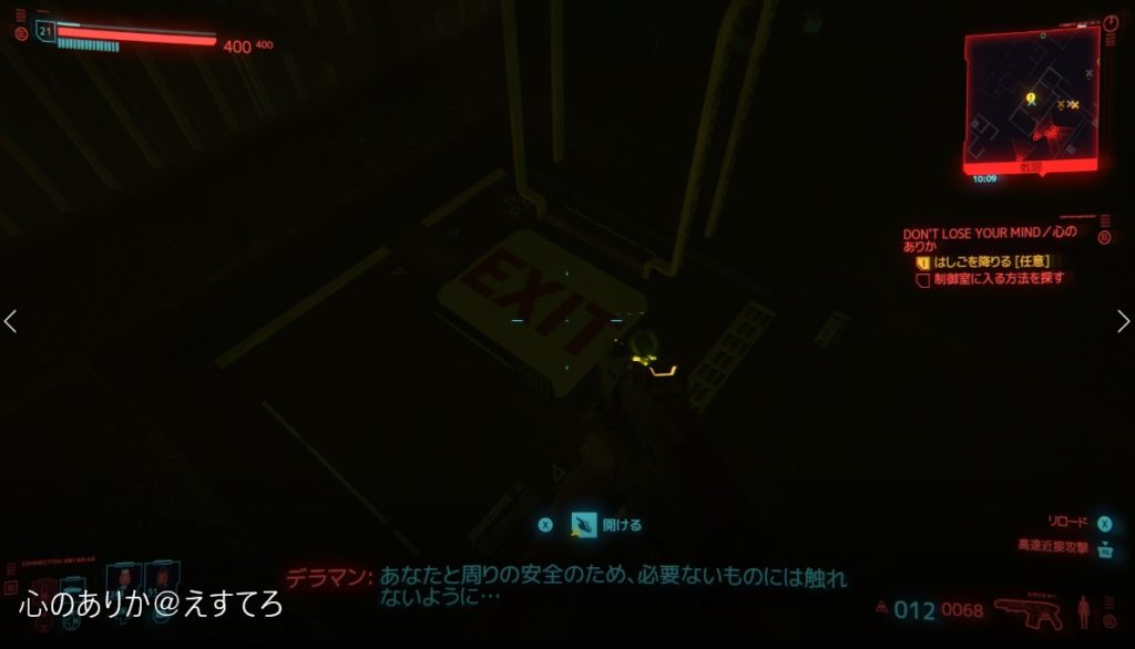 道中にいるドローン2体を倒し、道なりに進むとまたまたEXITがあるのでこれを開けてはしごを降りる(ここは技術は要りません)。