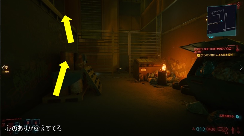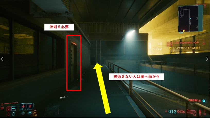 デラマン社受付横の扉が壊れているので、別のルートから社内に入る方法を探します。もうね…いきなりめんどくさいけど、一旦外に出てデラマン社の右側の方へ回ります。側面の扉は技術8ないと開けられないので、技術8ない人はさらに奥へ向かいましょう。