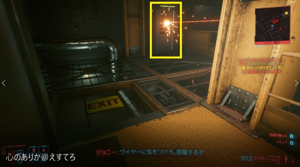 レーザーが当たっている扉に入る。技術10ある人は床にあるEXITのところも開けることができます。ショートカットではなくアイテム部品(レア)があるだけですが…。