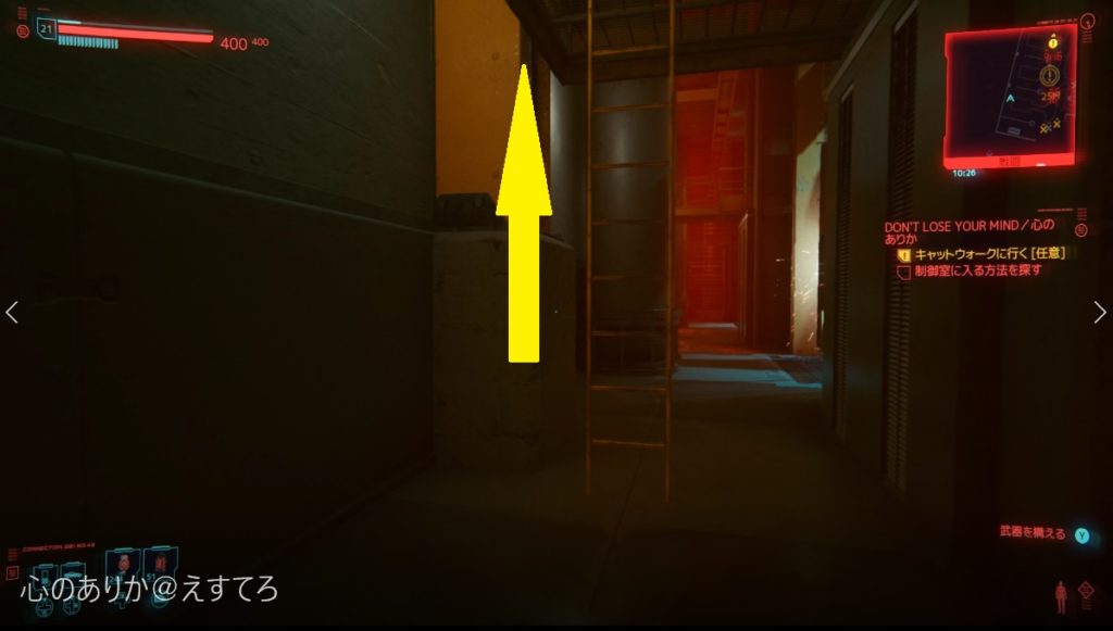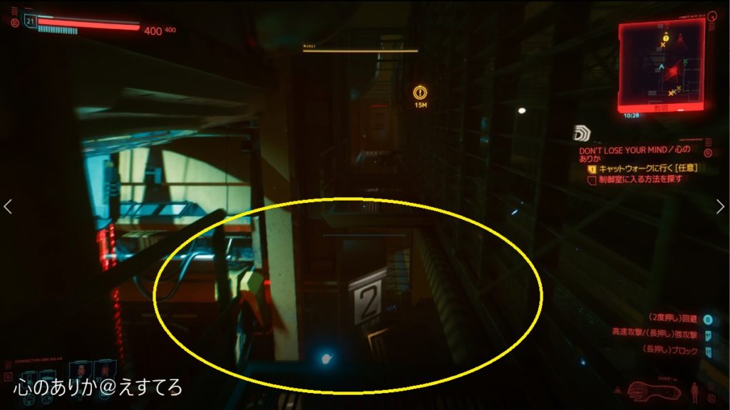 通路が壊れていてかなり大きな隙間が空いている。その為、ここはダッシュしながらジャンプしないと届かないので注意。渡った後に、右側を登っていけばキャットウォークに到着です。