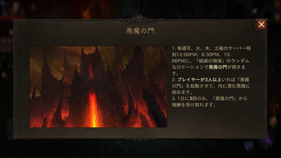 曜日と開催時間が決まっているゾーンイベントです。悪魔の門というポータルを起動させてボスモンスターを倒す討伐系のイベントとなっています。
