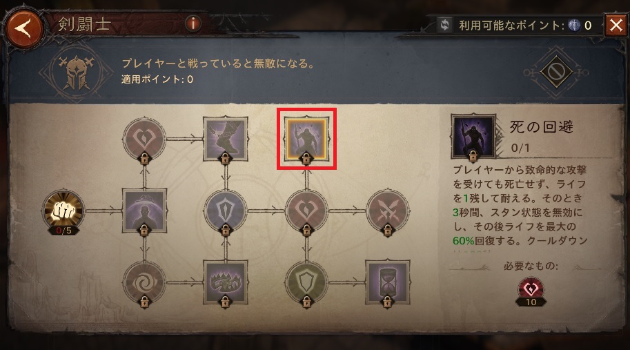 プレイヤーから致命的な攻撃を受けても死亡せず、ライフ1を残して耐える。そのとき3秒間、スタン状態を無効にし、その後ライフを最大の60%回復する。クールダウンは120秒。