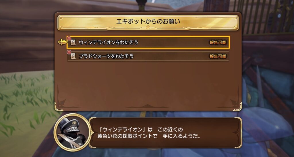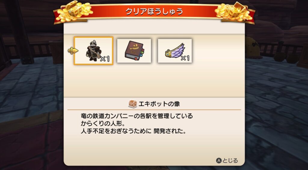 2つの駅を復旧させ車掌アビエンに報告すれば終了。報酬はエキボットの像・いやしピラフの上級レシピ・キメラのつばさです。
