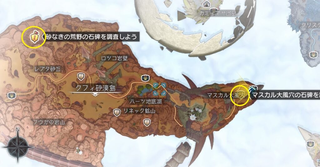 砂なき荒野の石碑とマスカル大風穴の石碑はクフィ砂漠島。