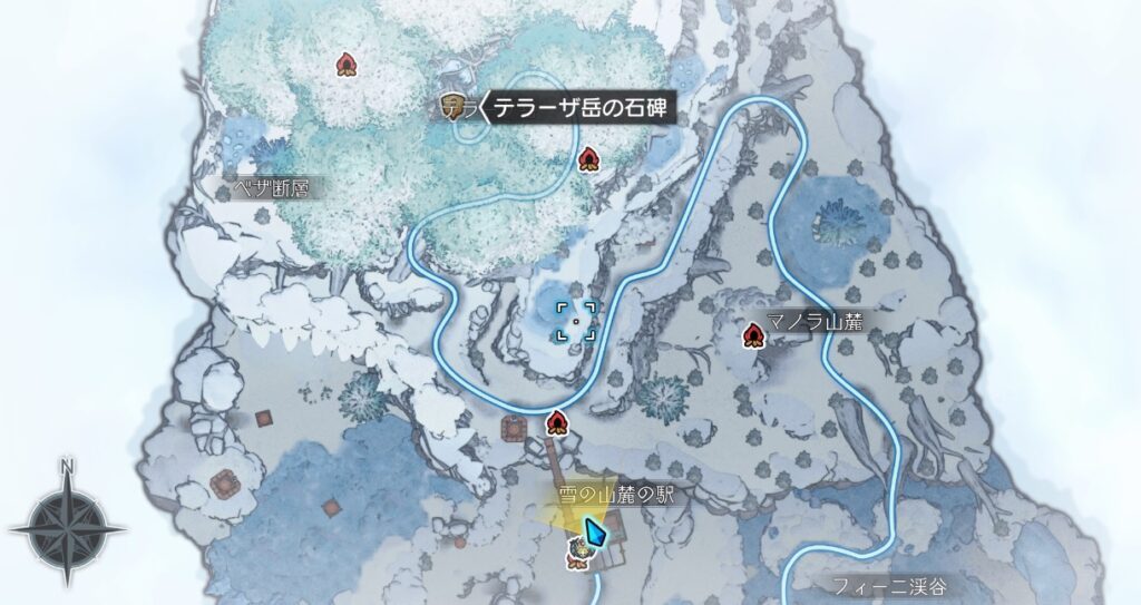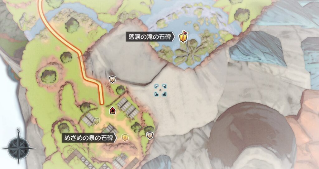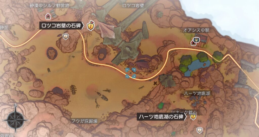 めざめの泉の石碑はゲーム最初にマヤがいた場所です。駅の近くにいる探検隊ユノウに話かけて、空賊のキャンプ前にショートカットすれば早いです。