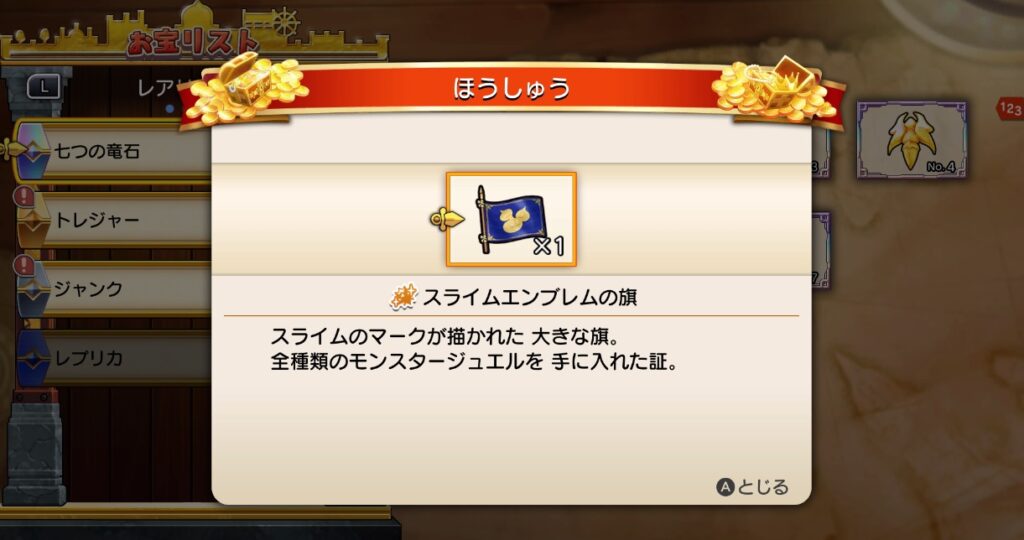 コンプリートするとスライムエンブレムの旗が入手できます。