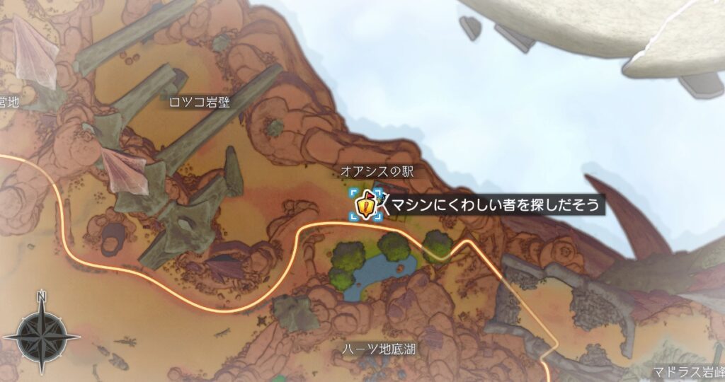 最初にデビルウェポンと戦った場所にいき、そこでモンスターの残骸を調べる。「マシンにくわしい者がいたら相談してみよう」のコメントが出て旅人クエスト「デビルウェポン編」が発生します。